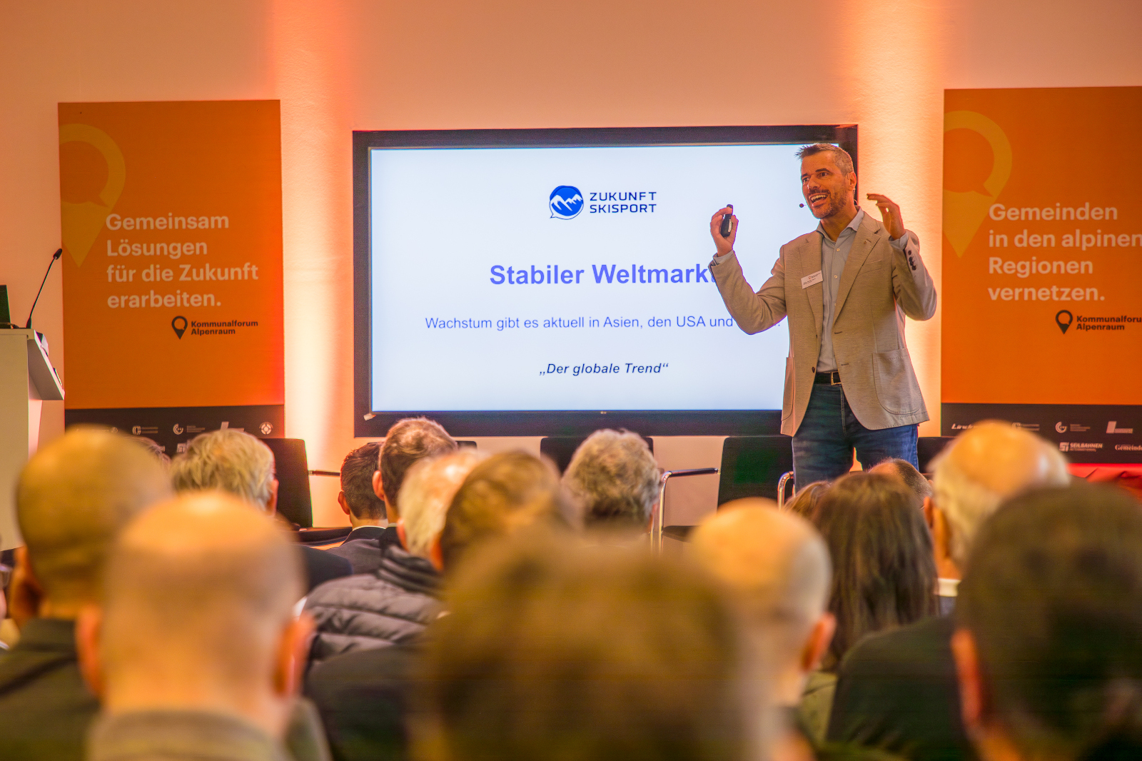 „Es gab noch nie so viele Skifahrer wie heute. Die Skifahrer werden uns nicht ausgehen“, zeichnete Skitourismusforscher Günther Aigner in einem Impulsvortrag ein optimistisches Bild. „Die 366 Millionen jährlichen Erstzutritte sind weltweit seit 25 Jahren stabil, 44 Prozent davon entfallen auf den Alpenraum. Österreich und Norditalien sind Skitourismusweltmeister.“ Als wichtigsten Zukunftstrend sieht Aigner die Luxurisierung, Skifahren werde elitärer. Gleichzeitig zeige das Beispiel USA, dass selbst im teuersten Skitourismusmarkt der Welt dynamisches Wachstum und neue „All Time Highs“ möglich sind. Zum Thema Klimawandel meinte der Experte: „Wir werden 2050 noch Ski fahren, selbst im Worst-Case-Szenario. Der Skitourismus hat sich von den meteorologischen Rahmenbedingungen entkoppelt.“ Was in öffentlichen Debatte oft untergehe, sei das Thema Nachhaltigkeit: „Skifahren ist zum Glück ökologischer als gedacht, da der CO2-Footprint von Beschneiung, Seilbahnen und Liften gering ist.“ Handlungsbedarf gebe es aber bei der Pistenpräparierung, die sofort dekarbonisiert werden müsse. Insgesamt eröffne die Klimaerwärmung neue Chancen für den alpinen Ganzjahrestourismus, zum Beispiel mit dem Thema Wasser am Berg.