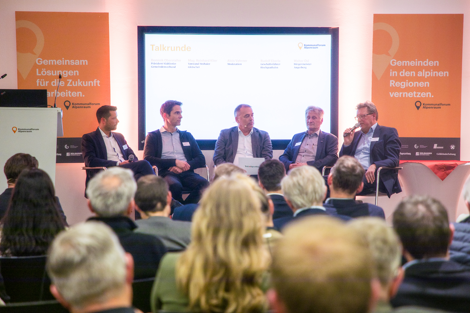 In der abschließenden Talkrunde diskutierten Reinhard Klier (Vorstand Stubaier Gletscher), Rudolf Eberle (Geschäftsführer Hochgratbahn), Walter Osl (Bürgermeister Angerberg) und Dominik Oberstaller (Präsident Südtiroler Gemeindenverband). Das Fazit: Dank technischer Beschneiung und laufender Innovationen sind die Regionen im Alpenraum gut aufgestellt, um die Herausforderungen der Zukunft zu bewältigen.